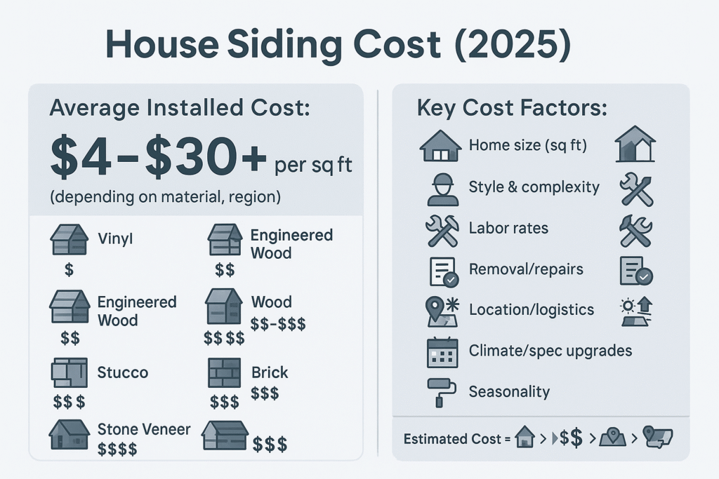 Material and grade. Vinyl is usually the budget pick; fiber-cement and engineered wood sit mid to upper; metals, stucco, brick/stone veneer trend higher. Typical installed ranges (national): vinyl about $2.5–$10.75/ft²; fiber-cement roughly $5–$15/ft².